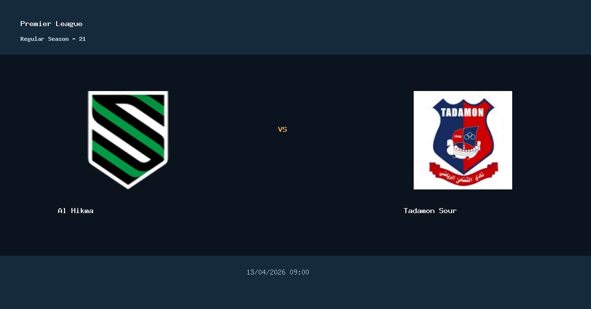O confronto entre Al Hikma e Tadamon Sour acontece em Local nao informado pela Premier League. A partida esta marcada para 13/04/2026 09:00.