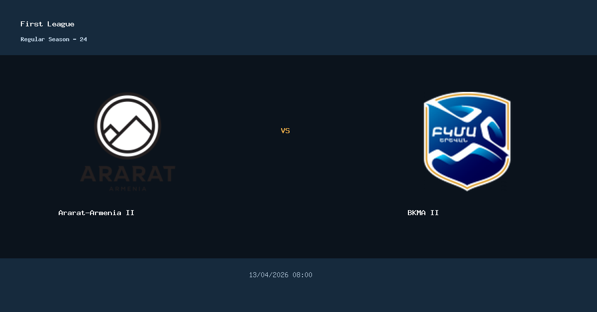 O confronto entre Ararat-Armenia II e BKMA II acontece em Local nao informado pela First League. A partida esta marcada para 13/04/2026 08:00.