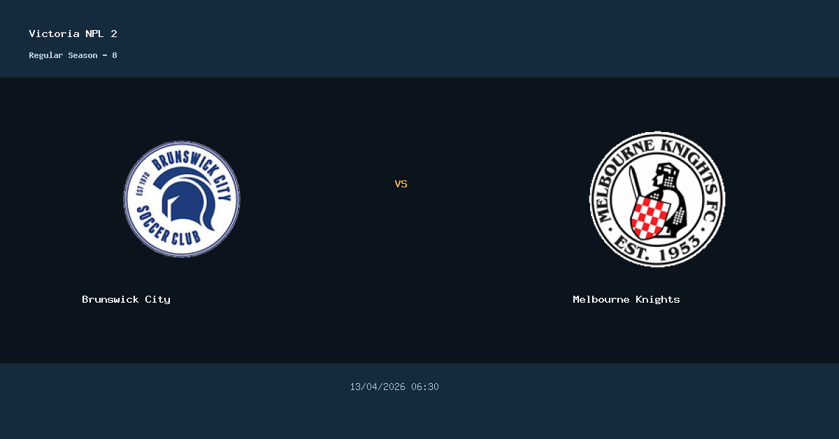 O confronto entre Brunswick City e Melbourne Knights acontece em Local nao informado pela Victoria NPL 2. A partida esta marcada para 13/04/2026 06:30.