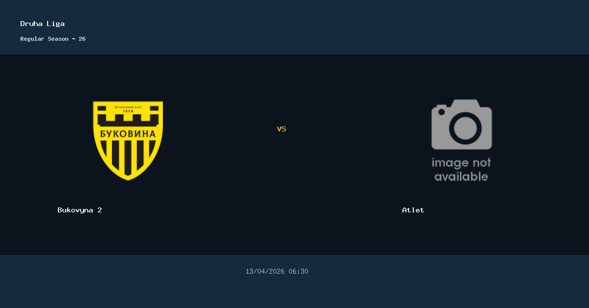 O confronto entre Bukovyna 2 e Atlet acontece em Local nao informado pela Druha Liga. A partida esta marcada para 13/04/2026 06:30.