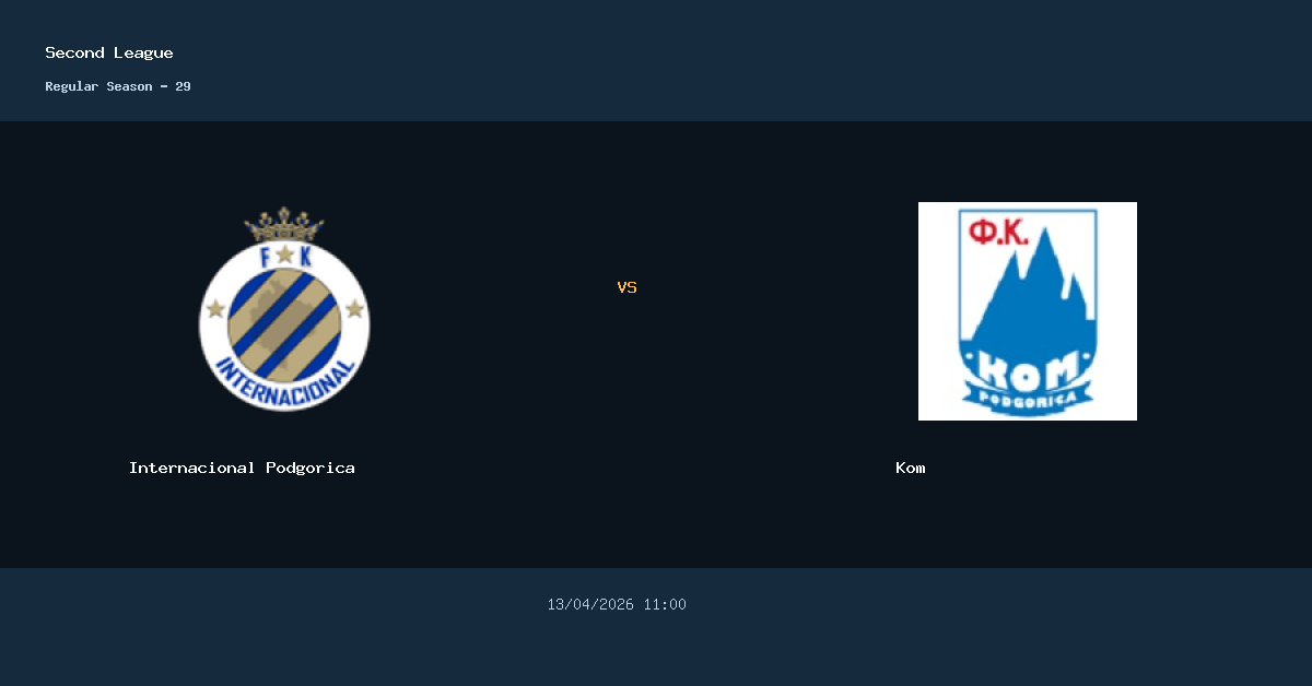O confronto entre Internacional Podgorica e Kom acontece em Local nao informado pela Second League. A partida esta marcada para 13/04/2026 11:00.