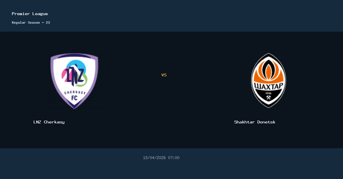 O confronto entre LNZ Cherkasy e Shakhtar Donetsk acontece em Cherkasy Arena pela Premier League. A partida esta marcada para 13/04/2026 07:00.
