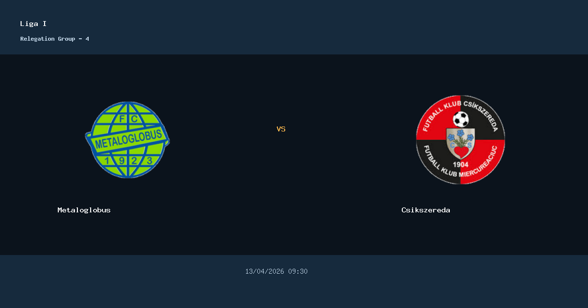 O confronto entre Metaloglobus e Csikszereda acontece em Metaloglobus Stadium pela Liga I. A partida esta marcada para 13/04/2026 09:30.