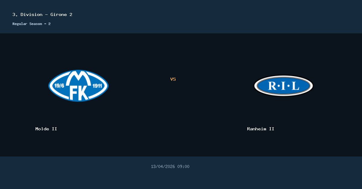 O confronto entre Molde II e Ranheim II acontece em Local nao informado pela 3. Division – Girone 2. A partida esta marcada para 13/04/2026 09:00.