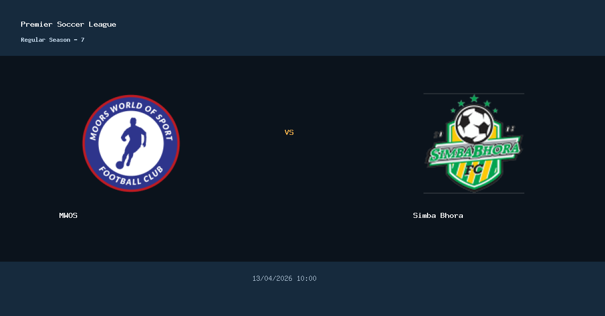 O confronto entre MWOS e Simba Bhora acontece em Local nao informado pela Premier Soccer League. A partida esta marcada para 13/04/2026 10:00.