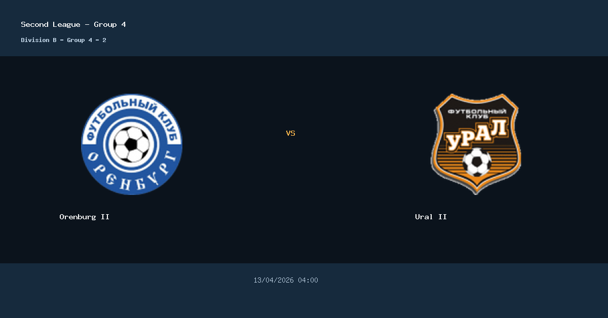O confronto entre Orenburg II e Ural II acontece em Local nao informado pela Second League – Group 4. A partida esta marcada para 13/04/2026 04:00.