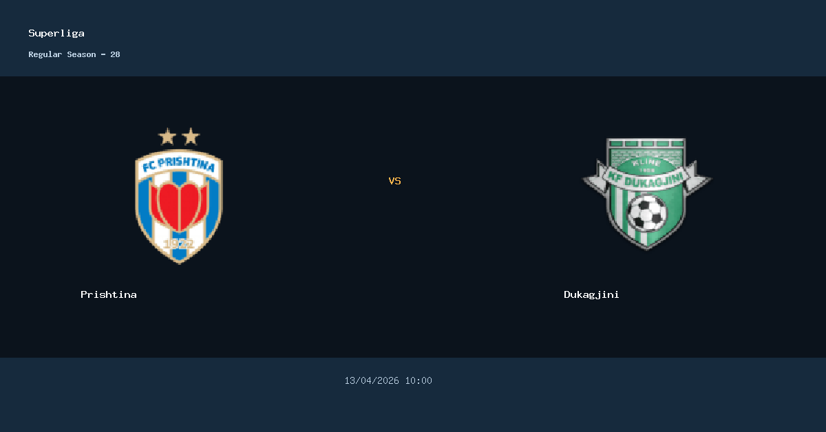 O confronto entre Prishtina e Dukagjini acontece em Local nao informado pela Superliga. A partida esta marcada para 13/04/2026 10:00.
