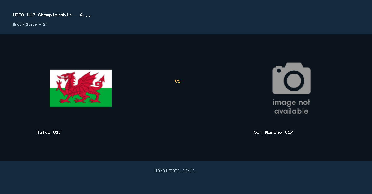 O confronto entre Wales U17 e San Marino U17 acontece em Local nao informado pela UEFA U17 Championship – Qualification. A partida esta marcada para 13/04/2026 06:00.