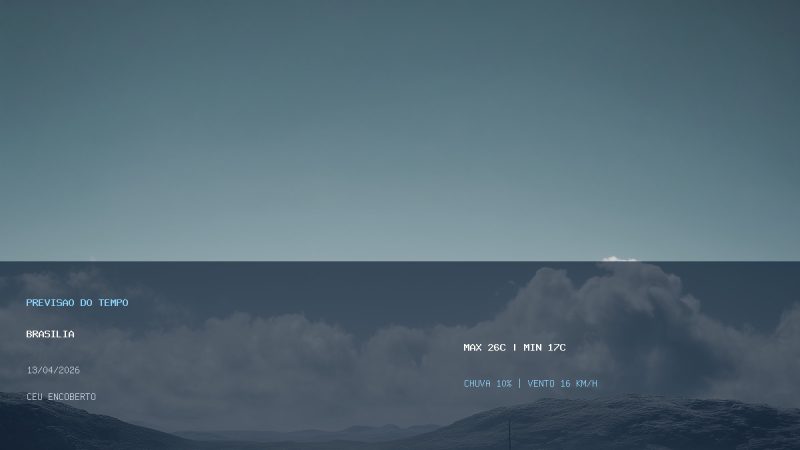 hedmiltonA previsão do tempo para Brasília indica céu encoberto ao longo do dia. A temperatura deve variar entre 17°C e 26°C. Neste momento, os termômetros marcam cerca de 20°C. A chance de...
