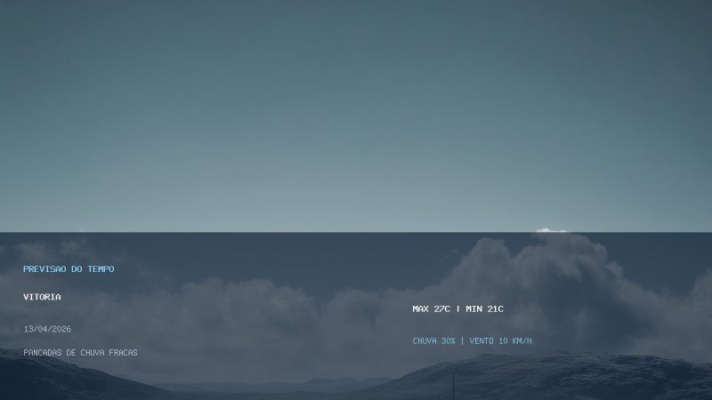 hedmiltonA previsão do tempo para Vitória indica pancadas de chuva fracas ao longo do dia. A temperatura deve variar entre 21°C e 27°C. Neste momento, os termômetros marcam cerca de 23°C. Há...