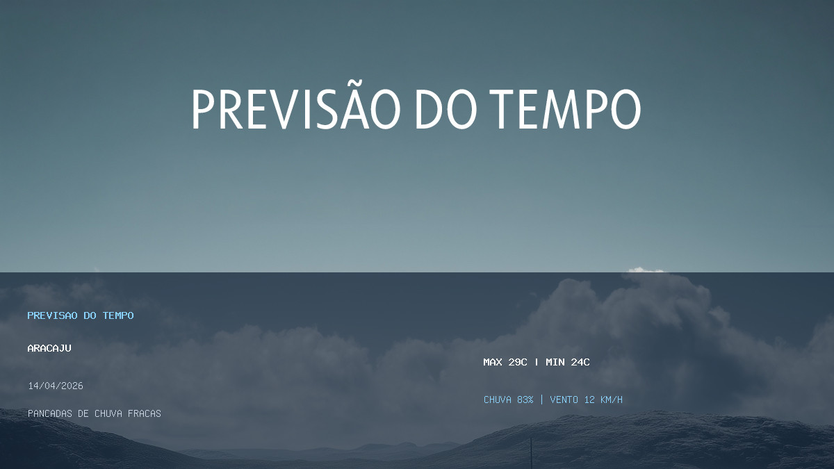 A previsão do tempo para Aracaju indica pancadas de chuva fracas ao longo do dia. A temperatura deve variar entre 24°C e 29°C. Neste momento, os termômetros marcam cerca de 24°C. Existe alta probabilidade de chuva, chegando a 88%. A umidade relativa do ar fica por volta de 95%.