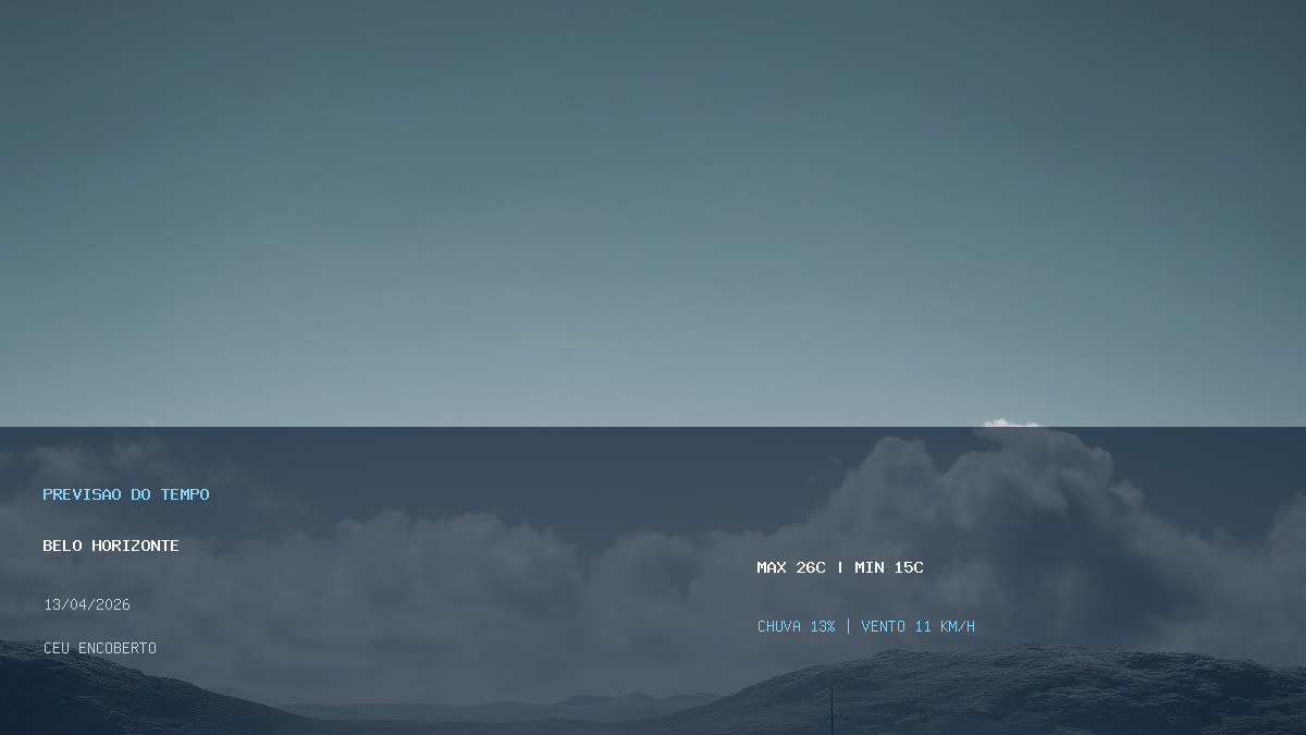 A previsão do tempo para Belo Horizonte indica céu encoberto ao longo do dia. A temperatura deve variar entre 15°C e 26°C. Neste momento, os termômetros marcam cerca de 20°C. A chance de chuva é baixa, em torno de 13%. A umidade relativa do ar fica por volta de 77%.