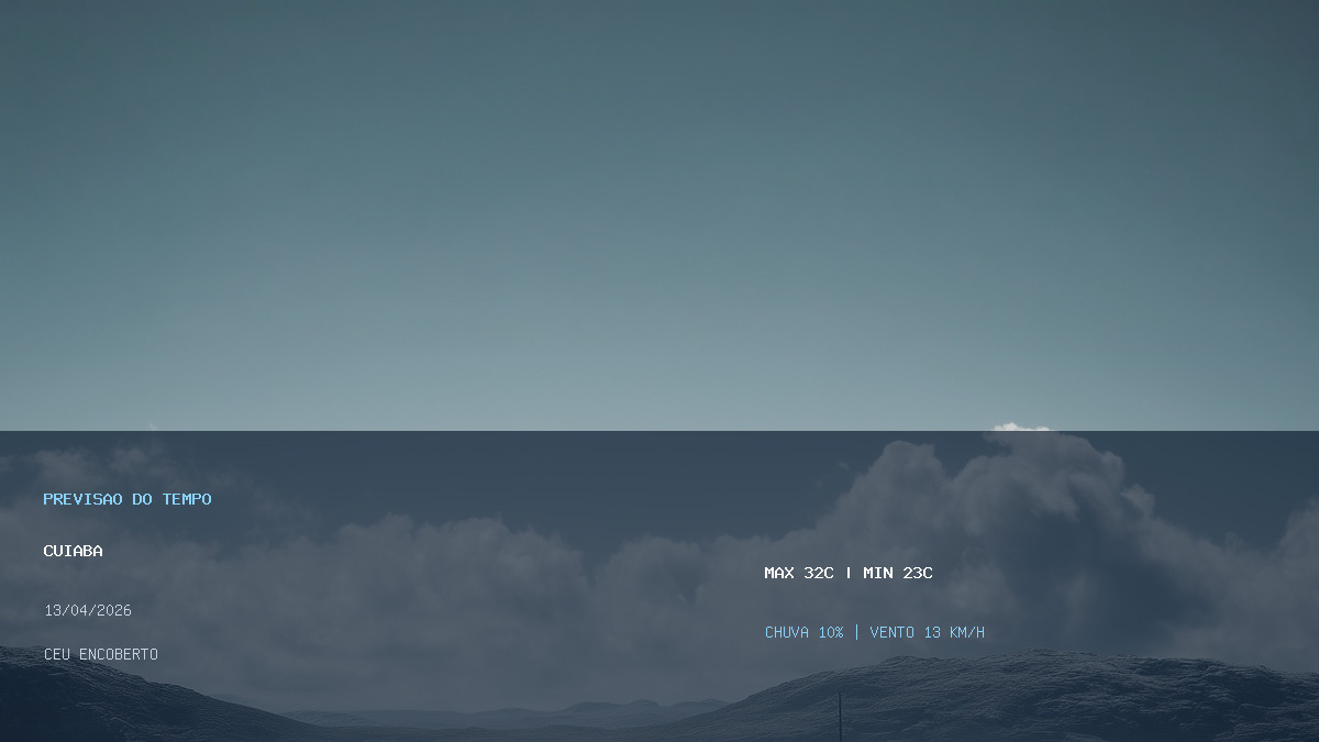 A previsão do tempo para Cuiabá indica céu encoberto ao longo do dia. A temperatura deve variar entre 23°C e 32°C. Neste momento, os termômetros marcam cerca de 28°C. A chance de chuva é baixa, em torno de 10%. A umidade relativa do ar fica por volta de 73%.